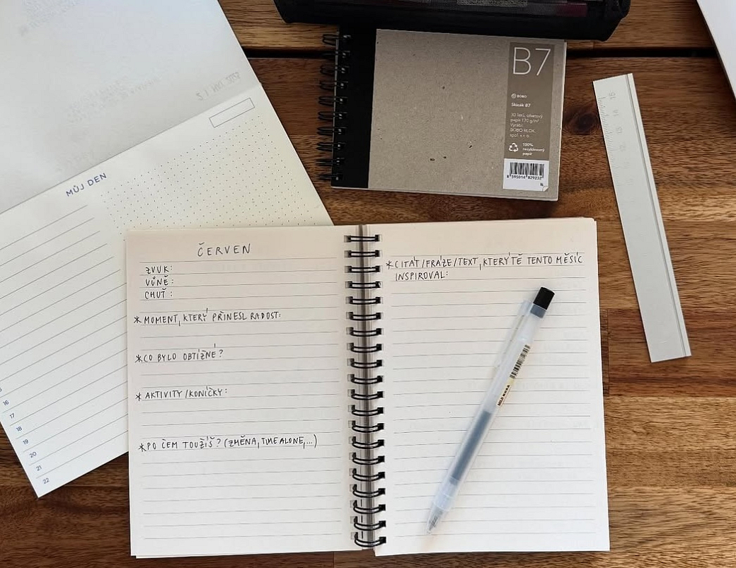Rozhodně bez diáře, to do listu a skicáku. A taky čehokoliv ve formátu B6. Není ani příliš malý, takže se na stránku vejde dost poznámek, ani příliš velký, takže se mi pohodlně vejde do kabelky a můžu si ho brát všude s sebou.