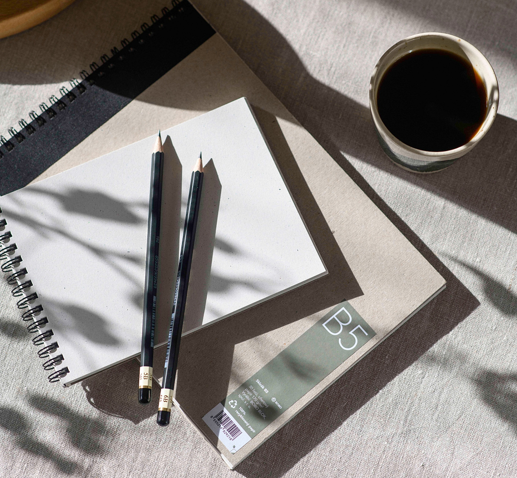 Záleží také na samotném papíru – jeho barvě a povrchu. Bílý papír je univerzální, ten krémový je však příjemnější na oči, zejména při delší práci. Hladký papír je vhodný pro detailní kresby, zatímco hrubší textura podpoří výraznější tahy.